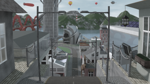 Stadtszene. Inspiration und Ideen: San Fransisco (San Fransokyo aus Baymax [engl. Big Hero 6]). Die Perspektive ist bewusst so gewählt, dass die Straße einem wie ein extrem steiler Abhang vorkommt. Man weiß nicht genau wie steil es wirklich bergab geht. Im Zentrum der Szene eine futuristische Oper (Konzerthalle).