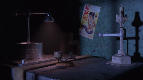 Erstes Projekt. Stillleben im Steampunk Stil.Viel Stahl und Rost. Nachtszene. Zeigt den Tisch eines Mannes, der sich in der Zeit des Fallouts nach dem alten und der Natur sehnt. Herzstück ist die Holzpfeife mit Blatt als Kontrast zu dem stählernen Objekten.